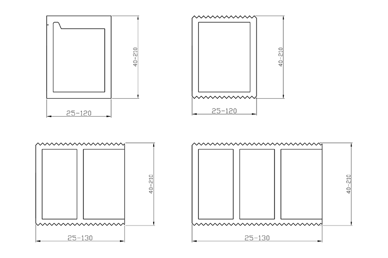 橫ロールの割數 2ツ割120~210mm 3ツ割80~150mm 4ツ割60~120mm 6ツ割40~75mm 橫シール幅によりピッチ可変範囲が異なる場合があります。 |
